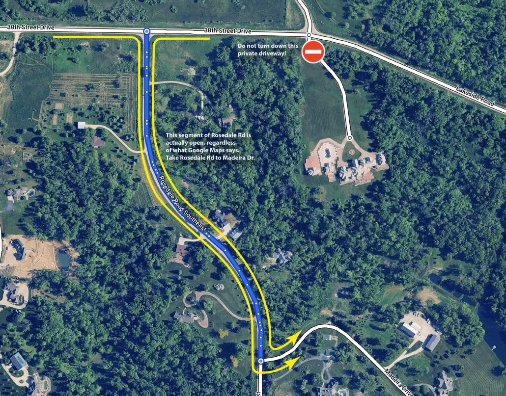 The biggest issue we are seeing is that Google Maps shows Rosedale Road being closed in its entirety. It is not. Since Google Maps is not correct, it is routing visitors to a neighboring property off go Lakeside Drive. This is not correct. If you turn down a residential driveway with a very large iron double-gate, Google Maps has taken you to the wrong location.